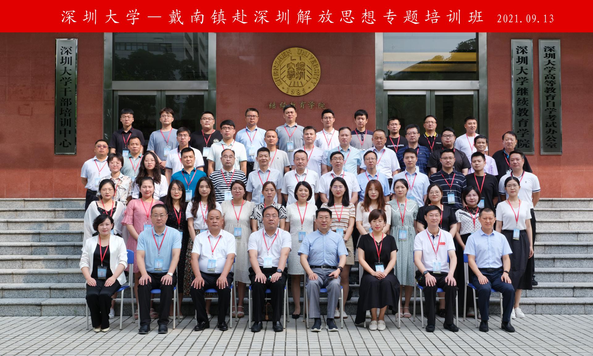 2021年9月13日至日,江苏泰州市兴化 戴南镇赴深圳解放思想专题培训班在深圳大学罗湖校区成功举办, 戴南镇党工委系统的共52位学员参加了此次培训。9月13日上午,戴南镇镇长姚群印、党委副书记朱纯,深圳大学继续教育学院院长杜龙、副院长郑志平与培训班全体学员合影留念。