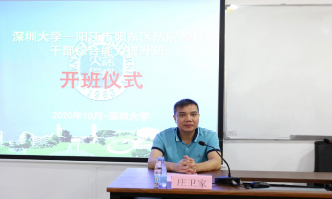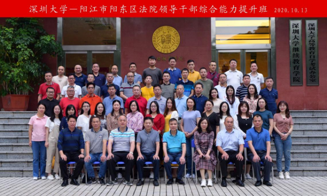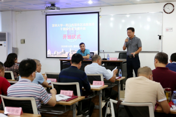 10月13日,阳江市阳东区法院领导干部综合素能提升班在深圳大学继续教育学院开班,阳江市阳东区人民法院党组成员、副院长庄卫家作开班讲话,深圳大学继续教育学院副院长刘子华致欢迎词,共56位学员参加培训。