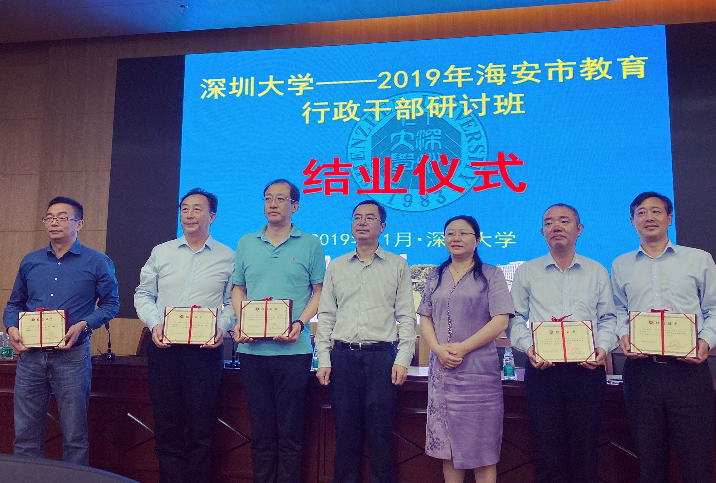 2019年11月9日至11月13日,由深圳大学继续教育学院承办的江苏省海安市教育行政干部研讨班在深圳大学粤海校区成功举行,来自江苏省海安市教育行政系统的60余名领导干部参加了此次培训并顺利结业。11月9日,培训班在深圳大学粤海校区开班。江苏省海安市副市长彭晓红,海安市人大常委会教科文卫工委主任崔世平,海安市委教育工委书记、教育体育局党组书记、局长章晓丽,海安市政协教文卫体和文史委主任汪宁,深圳大学副校长徐晨及继续教育学院院长杜龙等出席开班仪式。