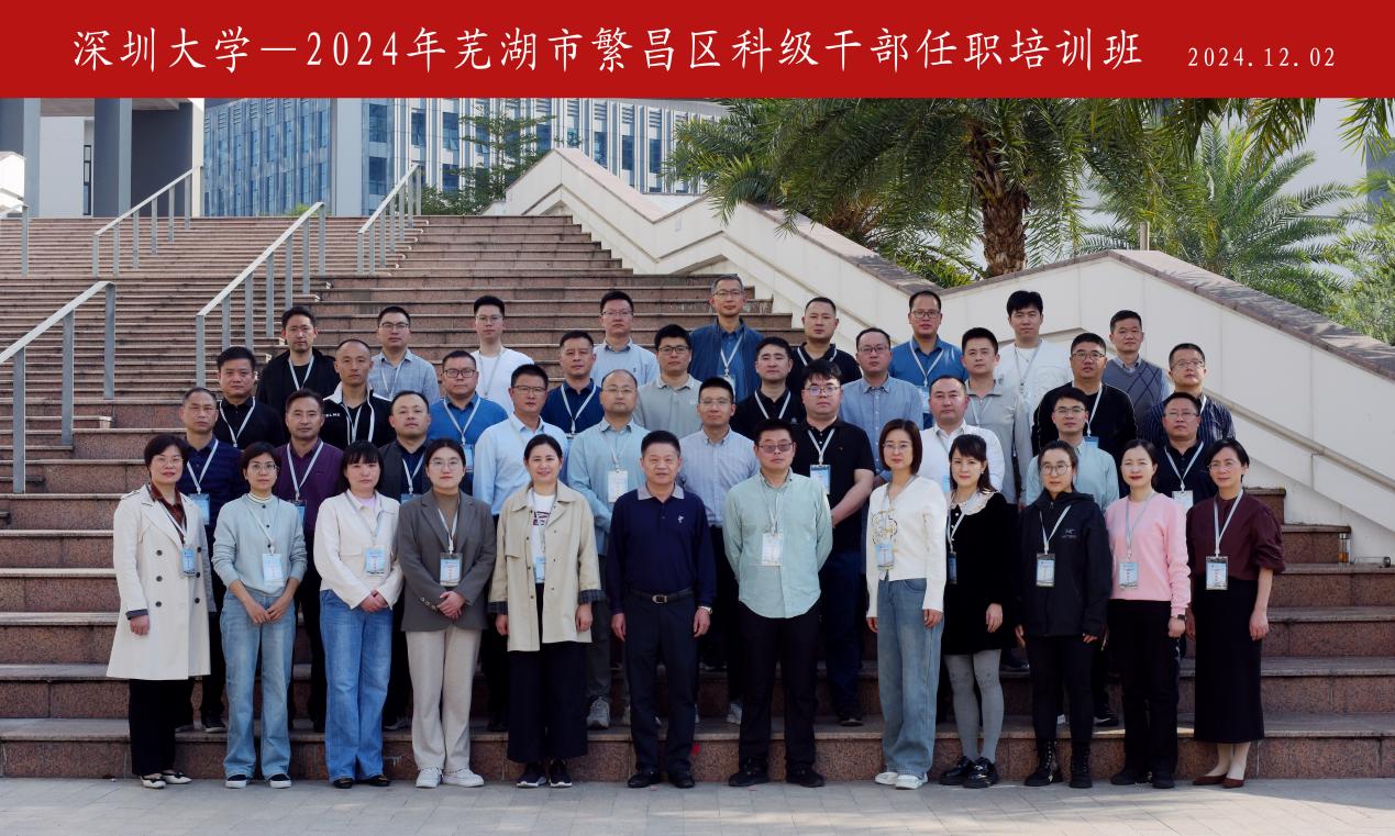 12月2日至6日,2024年芜湖市繁昌区科级干部任职培训班在深圳大学粤海校区举办,共计40名新提任科级干部干部参加了此次培训。繁昌区委编办主任、区委组织部副部长(兼)张学涛,繁昌区党员电教中心主任、区委组织部干部股股长王幼君,繁昌区委党校教研室主任古朝霞,深圳大学继续教育学院副院长刘子华出席开班式。