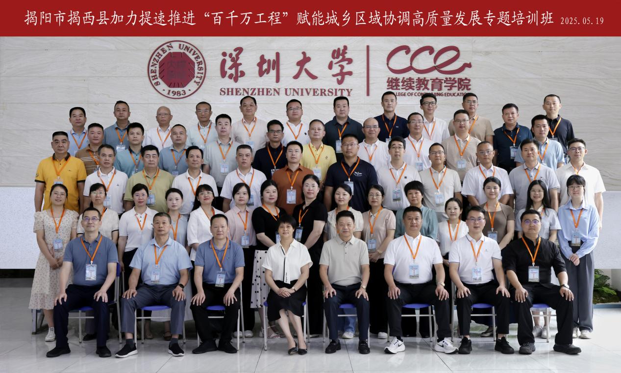 5月19日至23日,揭阳市揭西县加力提速推进“百千万工程”赋能城乡区域协调高质量发展专题培训班在深圳大学继续教育学院举办,共计55位学员参加培训。中共揭西县委常委、组织部部长、党校校长黄惜真,深圳大学继续教育学院副院长刘子华出席开班式并讲话。