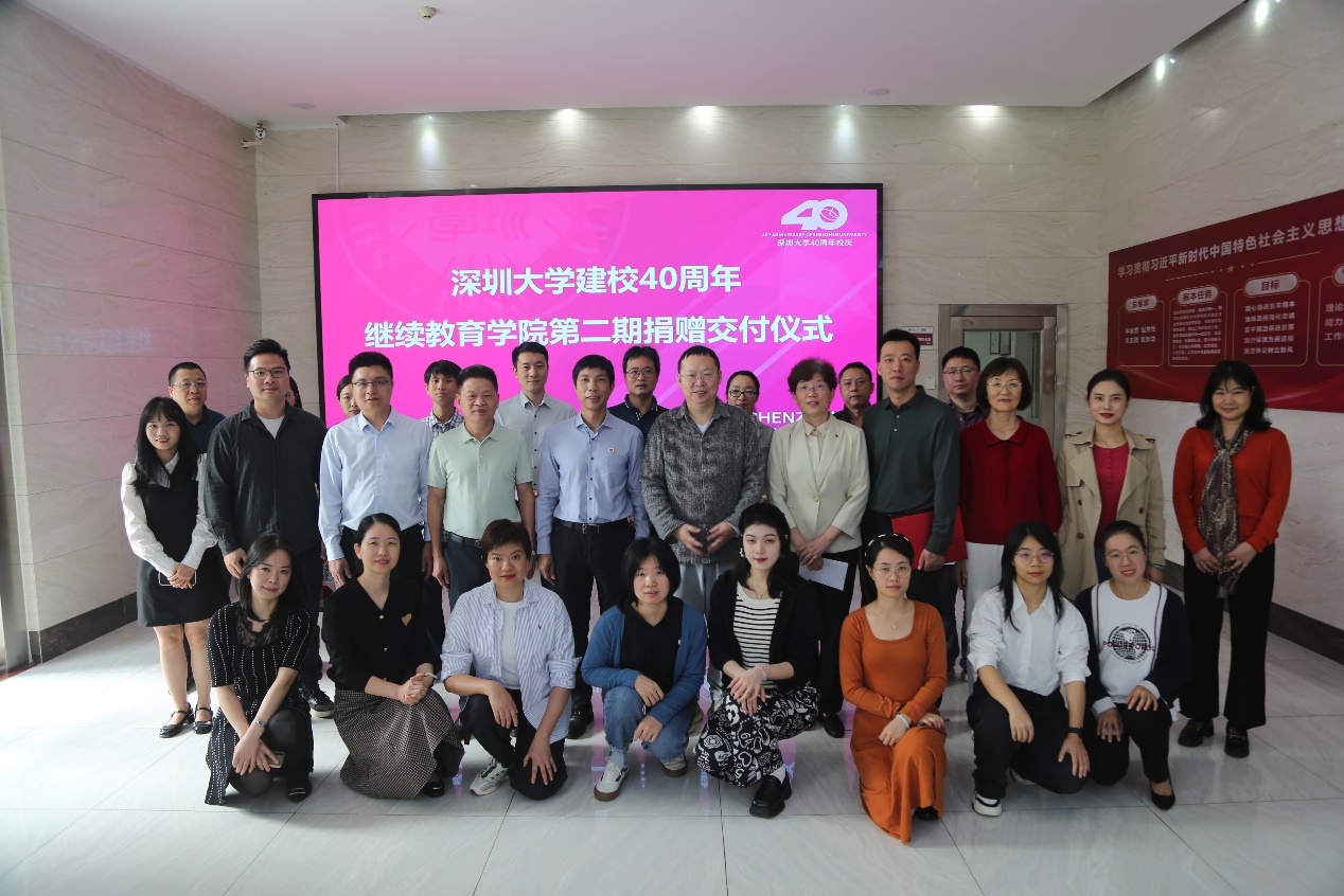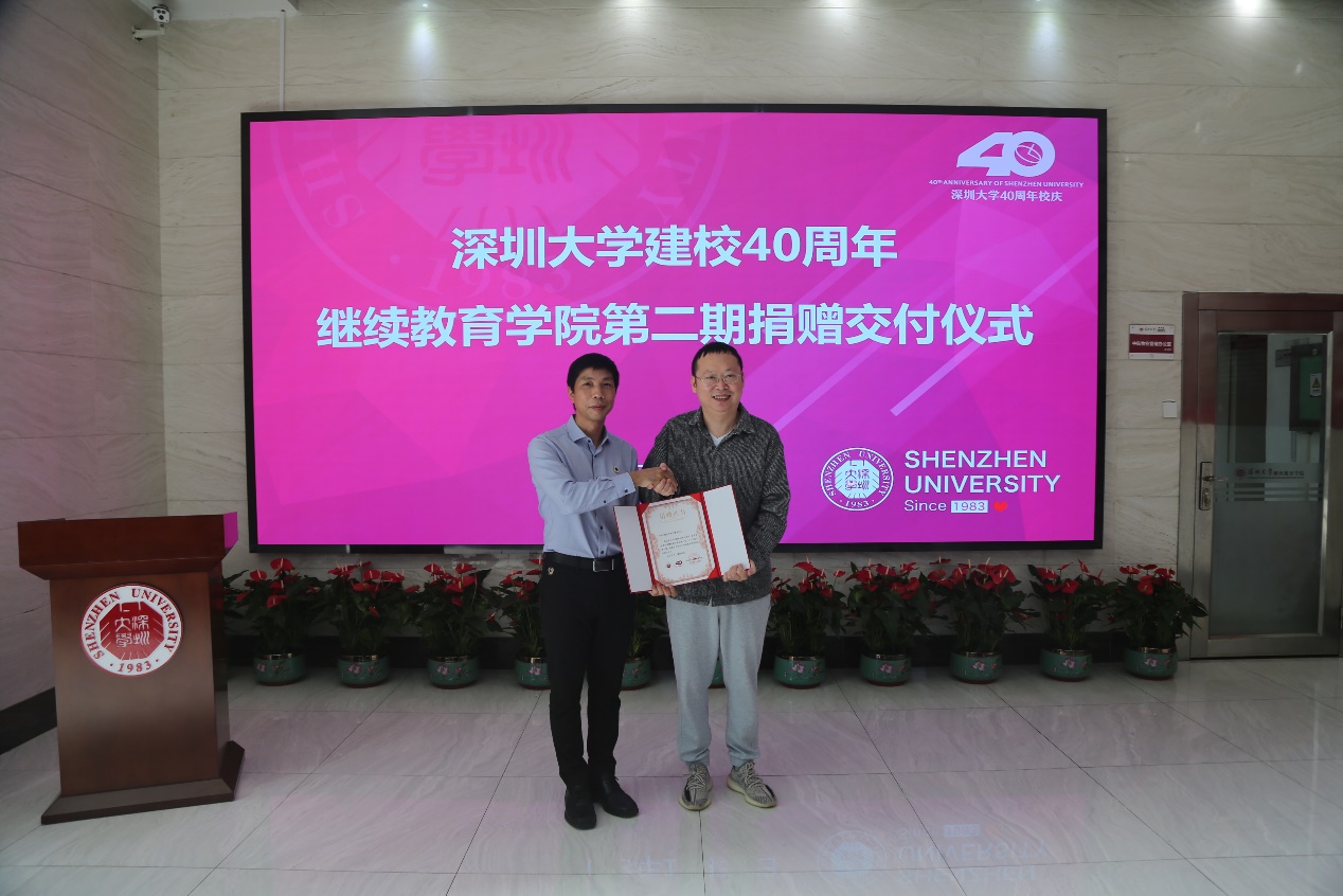 11月30日上午,深圳大学建校40周年继续教育学院第二期捐赠交付仪式在我院初心楼一楼大厅举行。捐赠单位广州达德自考辅导中心校长蔡伟、副校长甘建伟、自考部主任陈建斌与继续教育学院院长李伟文、党总支书记陈志行、副院长刘子华、院长助理陈富利和部分教师代表参加了捐赠仪式。捐赠仪式由刘子华副院长主持。
