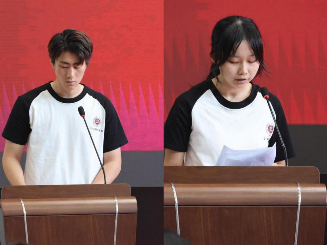 2024级新生代表张孟熙同学发言,他诚挚地表示将以饱满的热情投入到学习中,以深圳大学2+2国际本科项目为起点,开启新的学习征程,实现留学梦想。紧接着,新生代表王思蔻同学用流利的英文发言:“很高兴自己能就读深圳大学2+2国际本科项目,能站在这里展示自己,分享自己的愿景。面对新的挑战和机遇,我充满了期待,希望我们能够放飞梦想,遇见更好的自己”。